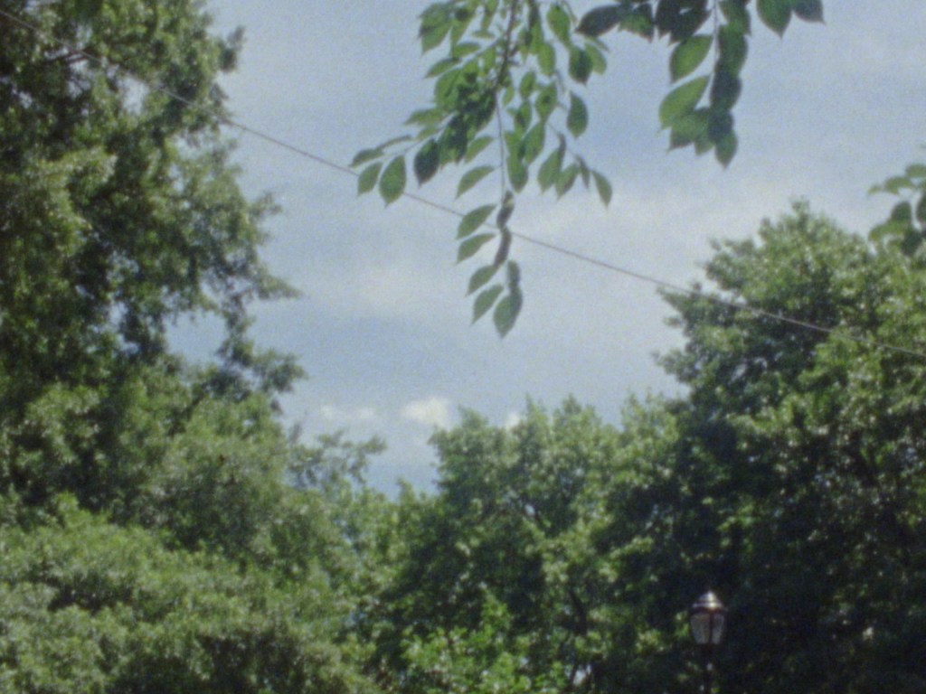 “Carter Haskins’ short silent film Airing is an urban pastorale, a genre that inherently carries a degree of irony. While the film evokes a scene reminiscent of the 19th century, it is subtly infused with modern, subversive elements. Shot on Super 8 film, its grainy texture makes the air itself feel tangible—atoms bumping and rubbing against each other. At the film’s center is a young woman seated on a blanket in a busy city park, drawing on a large piece of paper. Having recently watched several Jane Austen adaptations, I was reminded that outdoor watercolor painting was once one of the few respectable pastimes available to women. However, unlike Austen’s heroines—spirited though they may be—Haskins’ subject wears visible tattoos, a nose ring, and casually bares more skin than would ever have been deemed appropriate in polite society. Traditionally, such overt expressions of female sexuality are frowned upon in bourgeois culture. Yet, paradoxically, the idealized female nude has long been acceptable as an object for the artist’s gaze. The woman in Airing, however, appears indifferent to how her appearance might be interpreted. She asserts control over her body and presence, undisturbed by those around her. Upon closer inspection, we realize that the picture she’s painting isn’t a rendering of her immediate surroundings, but rather an imagined pastoral scene populated with nude figures in various poses—a nod to a long bohemian tradition in representational art. The camera then cuts upward to the sky, framed by tree branches rustling in a gentle breeze. It is a timeless image, disrupted only by the stark line of a telephone wire cutting across the frame. As a silent film, Airing self-consciously connects us to the early history of cinema. But it also gestures toward the broader history of visual art. While most early silent films were accompanied by live music or sound effects, other forms of visual art—such as painting and sculpture—are experienced in silence. This quietude hints at the film’s aspiration to be accepted as fine art, an aspiration it fulfills.