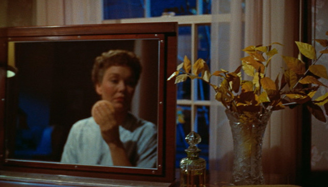 In All That Heaven Allows, mirrors are used to symbolize the subtextual relationships between characters and to progress the narrative. A mirror which Cary (Jane Wyman) uses to powder her face (see fig. 1) becomes the frame in which her children Kay (Gloria Talbott) and Ned (William Reynolds) are first seen. She gazes at the branch Ron (Rock Hudson) picked for her until her children (see fig. 2), as they will later in the film, come between her and Ron (the branch acting as a surrogate for him throughout the film). “In a beautifully composed shot, the children first appear reflected in the mirror, coming between Cary and the vase, and then, as the camera pulls away, she is taken back into the room and towards the children. This one shot tells the story of the dilemma that Cary will face for the rest of the film and is typical of Sirk’s emblematic, economical use of cinema” (Mulvey). The entire plot of the film is summarized in this one short shot–the first half of which, like Cary’s love affair with Ron, is unmediated–although we see her face through a mirror, her gaze is direct. Her connection with Ron, symbolized by the branch in the vase, is true. It is only when Kay and Ned arrive that our gaze, directed through the mirror by a dolly, becomes only that of a reflection. It is an imperfect, tainted image, not one of a real, true family, just the reflection of one. This family dynamic continues to be strained, and mirrors are frequently a part of this relationship.