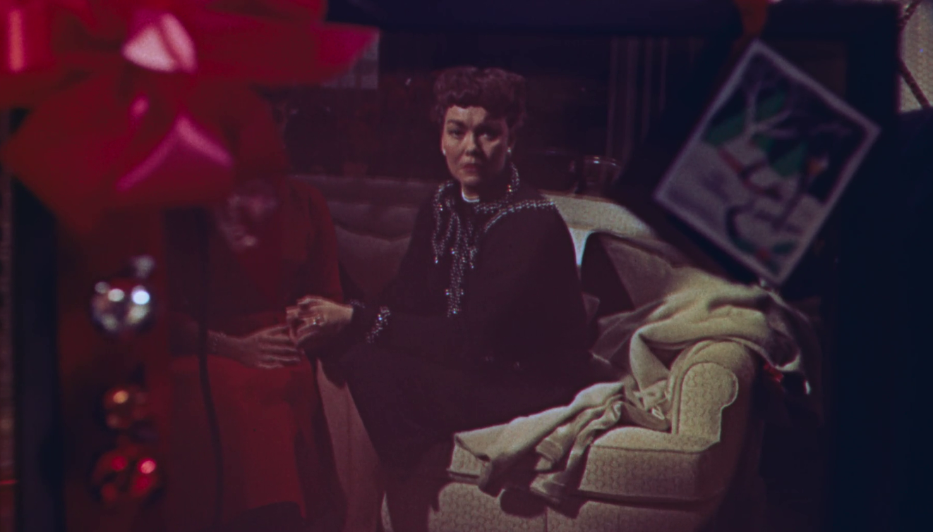 Near the end of the film, after Kay and Ned have informed Cary that they intend to leave the home regardless of Cary’s sacrifice to leave Ron, they have one final gift before departing. Ned says a soft “Merry Christmas” before carrying a television set into the living room with a salesman. A reverse shot shows both Cary and Kay looking miserable on the couch before cutting back to what was described by film critic Fred Camper as “one of the most chilling moments in any film” (Camper). As the camera dollies into Cary’s reflection on the television screen (see fig. 4), the salesman says “All you have to do is turn that dial and you have all the company you want, right there on the screen. Drama, comedy, life’s parade at your fingertips” (Sirk). Cary is alone in the reflection while Kay, who is sitting right next to her on the couch, has her head obscured by a bright red bow in the corner of the television set. The shallowness of their familial bond is manifested through this gift; Kay and Ned believe their absence in the household can be filled by a television, their lives replaced by the hollow promise of company provided through images playing out on a screen (a screen she is reflected, alone, in).